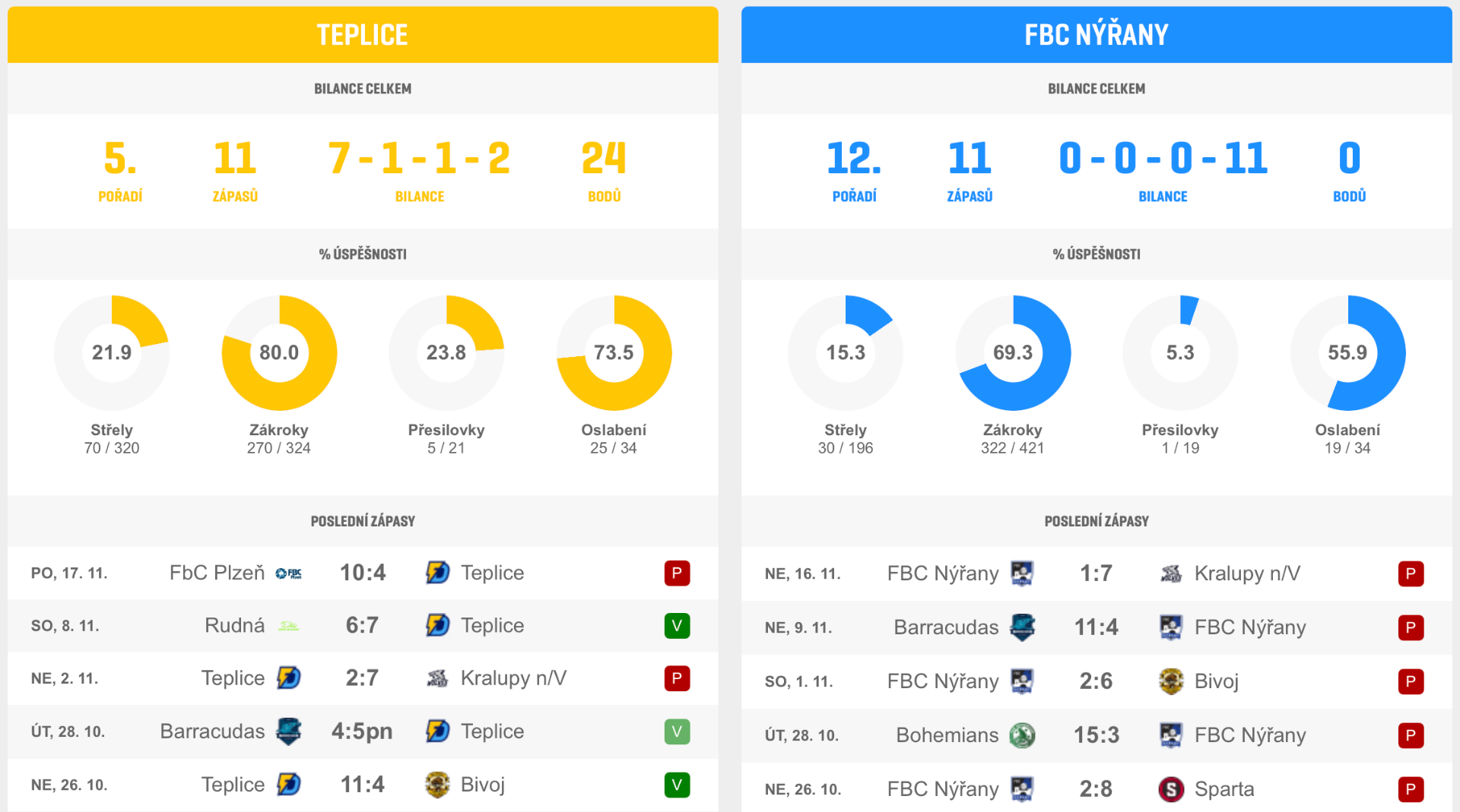 Statistiky obou týmů: