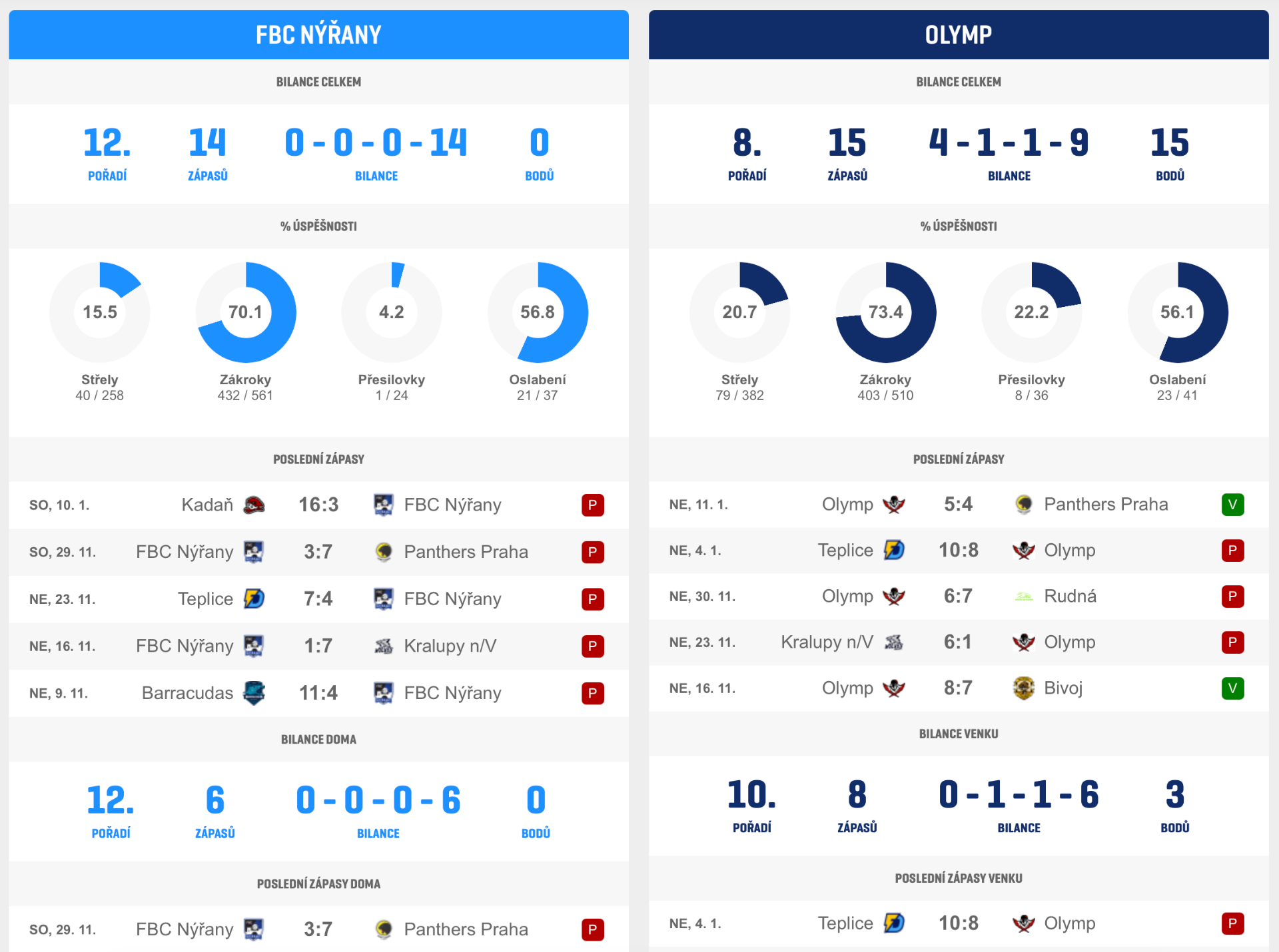 Statistiky obou týmů: